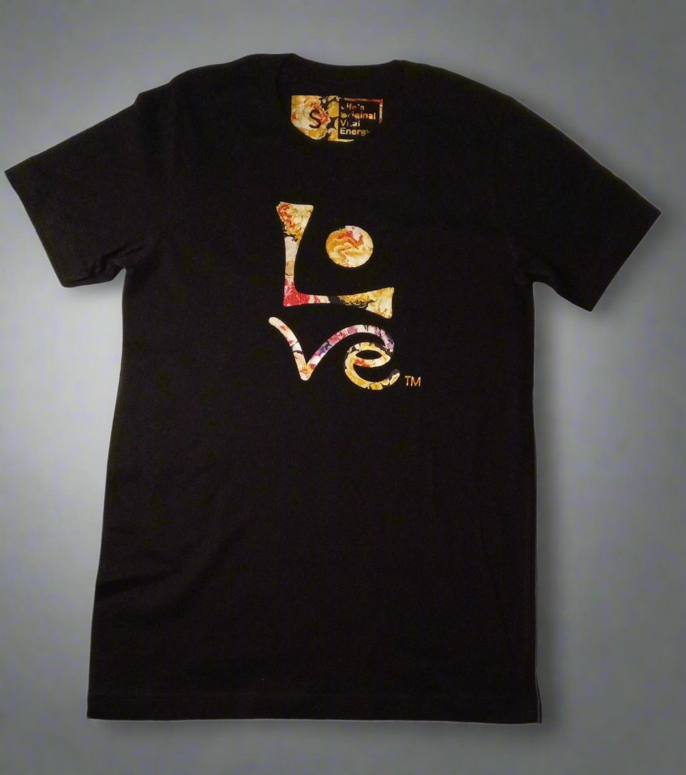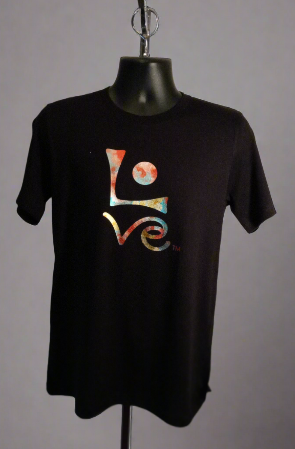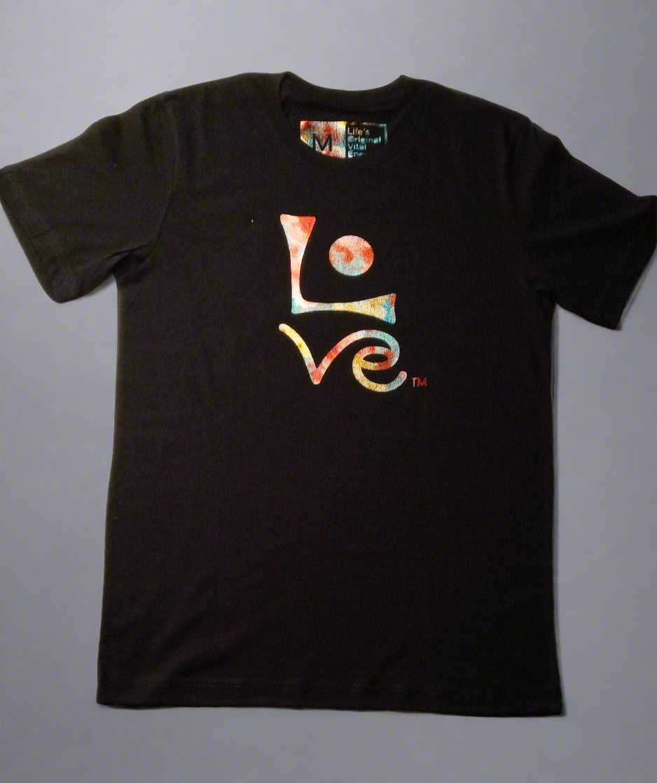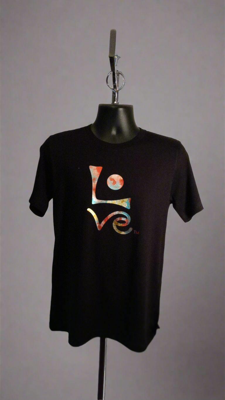 100% cotton t-shirt, unisex relaxed fit tee, soft breathable fabric, black t-shirt with “L.O.V.E.” logo, modern design, versatile wardrobe essential, lightweight comfortable shirt, true-to-size fit.